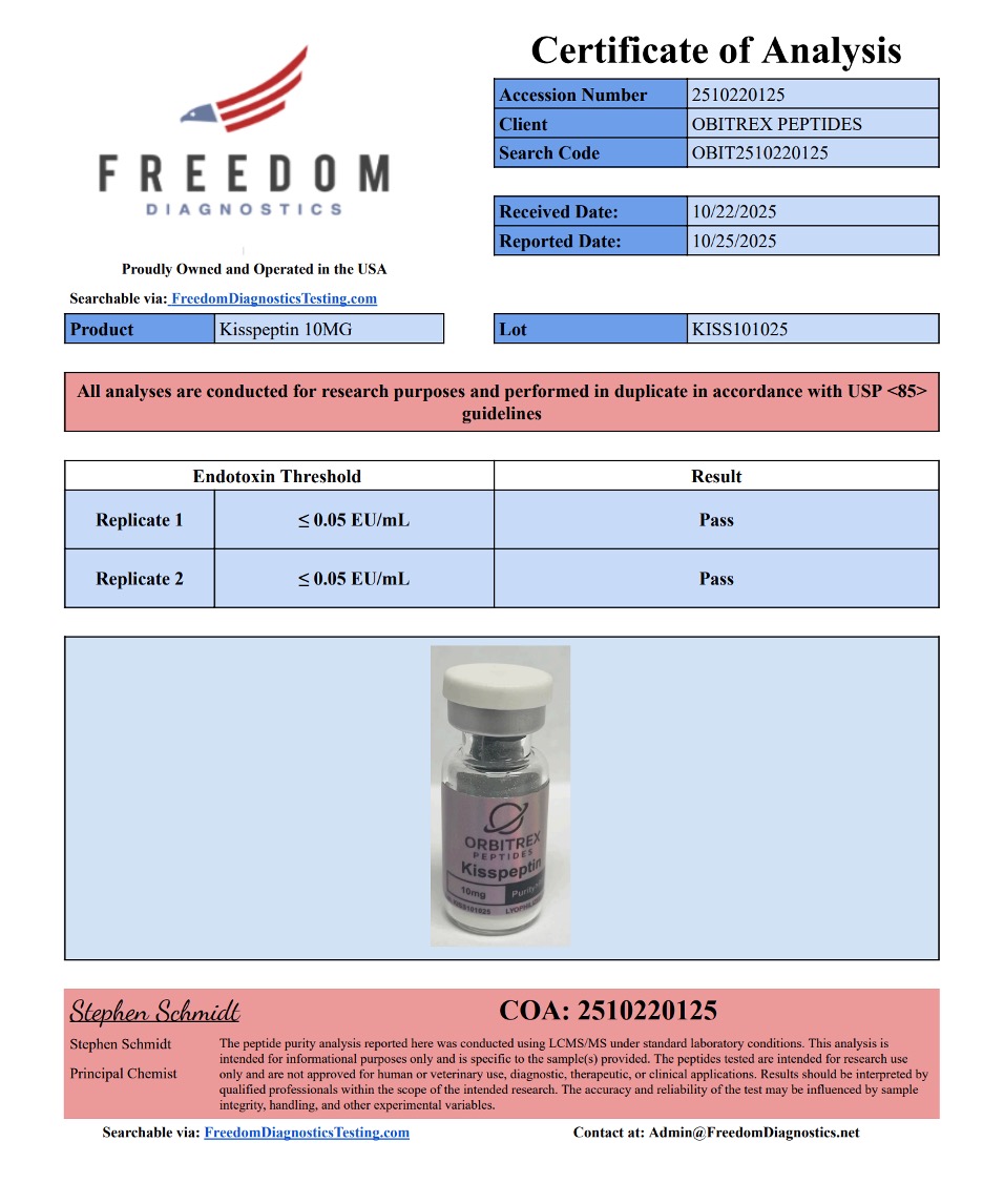 Kisspeptin is a decapeptide, or ten–amino acid part, of the kisspeptin protein. It plays a main role in controlling reproductive function in mammals. Researchers value this peptide because it is part of the hypothalamic-pituitary-gonadal (HPG) axis, which controls hormone release and fertility. Because of this, it has become a key focus in reproductive and peptide research.