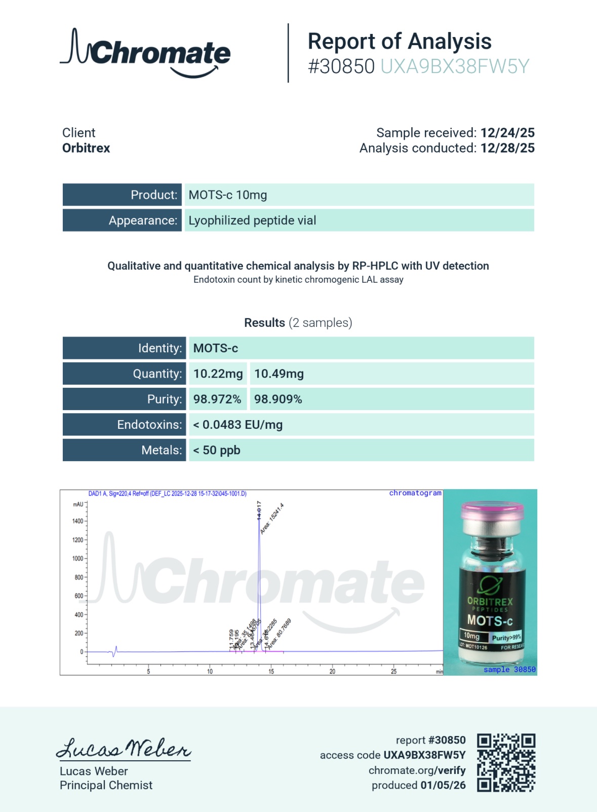 MOTS-c is supplied in lyophilized powder form, ensuring stability during long-term storage and convenient preparation for research applications. Every vial is backed by rigorous 3rd-party verification, with 99%+ purity guaranteed and documented through independent Certificates of Analysis. This commitment to accuracy and transparency allows researchers to move forward with complete confidence in their data.