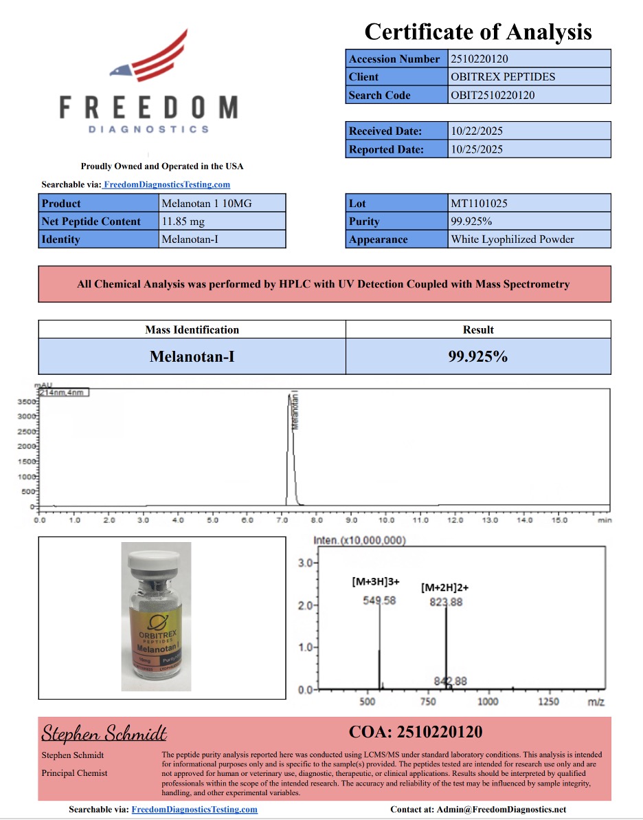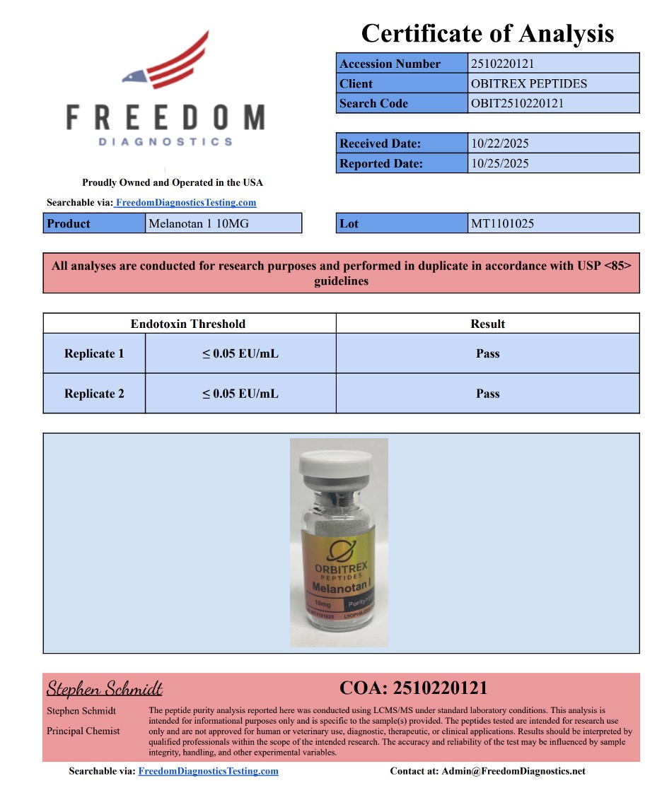 At Orbitrex Peptides, we specialize in delivering precision, purity, and research reliability. Our MT-1 (Melanotan-1) peptide is manufactured to the highest standards and independently verified, ensuring researchers can depend on accurate and reproducible results.