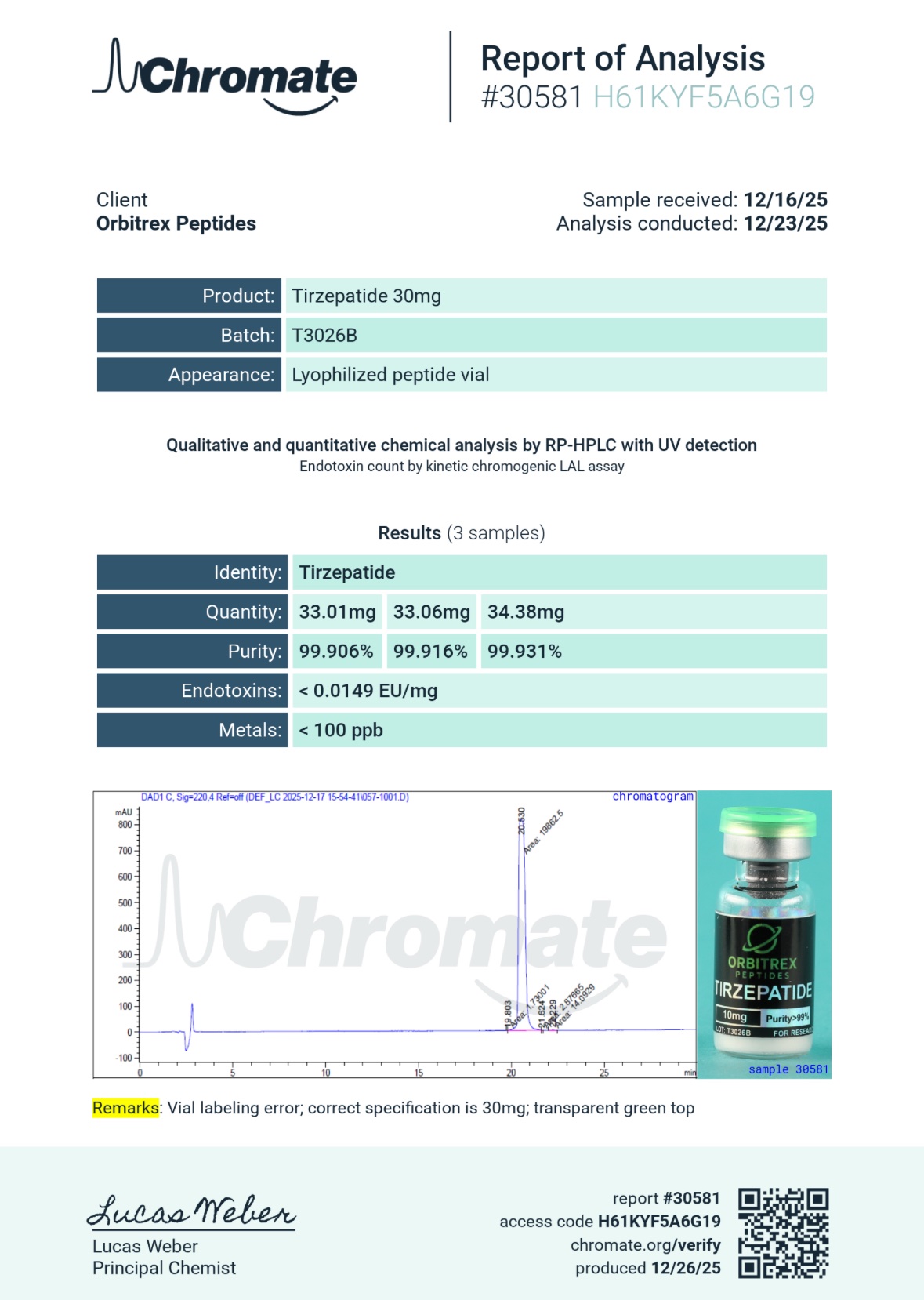 - Verification: Qualitative and quantitative chemical analysis by Reverse-phase HPLC with UV Detection. Endotoxicology verified using kinetic chromogenic LAL assay.